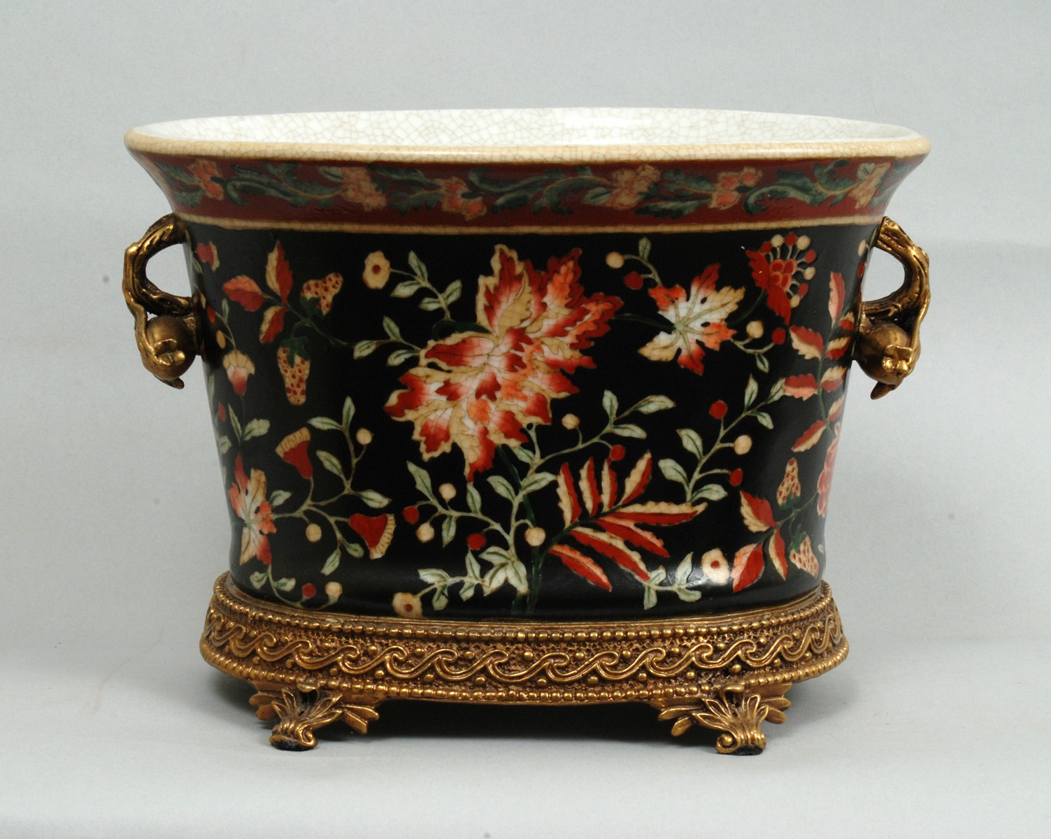 This black and burgandy oval centerpiece bowl includes subtle green and yellow colors and a crackled glazed surface. The porcelain piece is augmented by an aged gold-finish base and handles. Makes a lovely planter also!